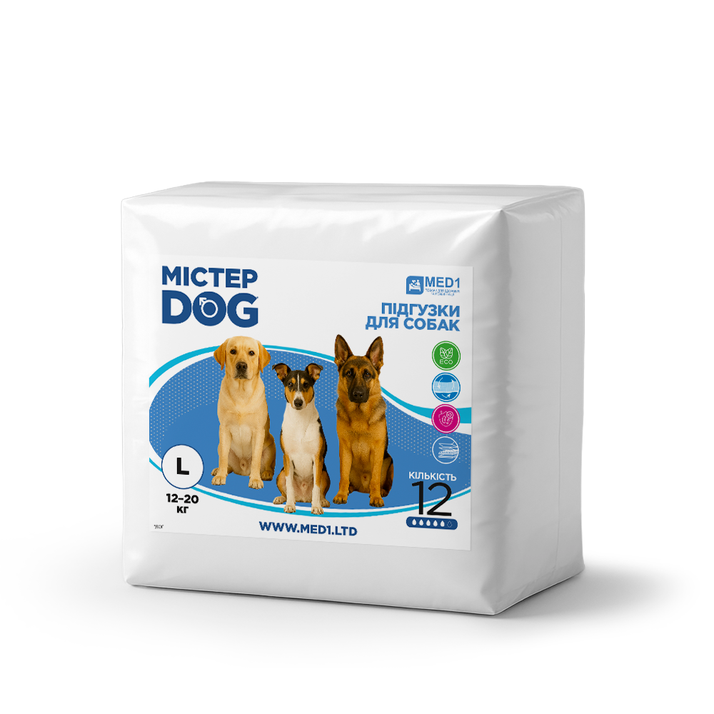 Підгузки для собак Містер Дог, розмір L (12 шт. в пакованні) MED1-MD-L — надійно захищають ваш будинок і меблі від виділень і допомагають підтримувати гігієну вихованця.
